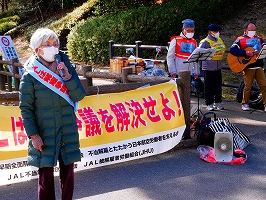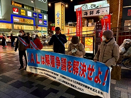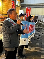 2月9日、立川駅定例宣伝(主催:JAL闘争支援三多摩共闘会議)青空が広がり日射しがあっても風が冷たい日曜の午後。大勢の市民が行き交う中、何人かの方から励ましの声をかけて頂いた。82年2月9日は羽田沖事故が起こった日。管理強化、職場の疲弊と安全問題についても組合から訴えた。