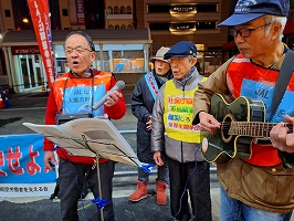 2月27日松山市駅前宣伝行動。寒さ和らぎ、春の気配の松山。今夜は支援者の皆様にマイクを渡し、それぞれの想いを訴えていただいた。四国トレインズの歌声も夜空に響き渡り、立ち止まって聞き入る方々も。手応えのある宣伝となった。
