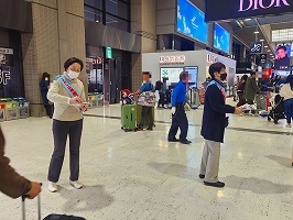 2月28日成田空港宣伝。愛媛在住の争議団員も参加し賑やかな宣伝になりました。出発階では何人もの方から頑張って下さいとの反応がありました。会社の玄関前では、襷をかけた争議団員が多いせいか、日本語チラシは全部なくなりました。15年経過しても顔見知りの方が声をかけて下さり嬉しく思います。