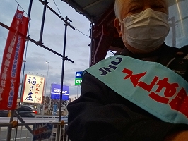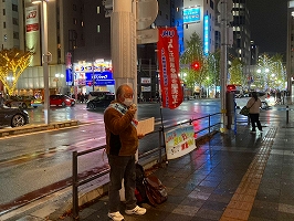 12月26日、博多筑紫口宣伝。気温3°C、風速4m/sの寒さの中、宣伝に耳を傾け、更にビラを受け取ってくださった若い方がいらっしゃいました。応援ありがとうございます!パワーを頂きました。