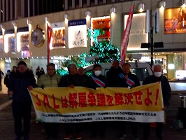 12月25日雨上がりの名古屋の中心街、三越前で愛知の会の皆さんと7名で、モノ言う労働者排除と組合潰しを目的としたJALの不当解雇の実態を訴えました。また、毎週月曜日にBSで放映中の「沈まぬ太陽」は現在のJALそのものですとも訴えました。クリスマスとあって若い人達のカップルが目立ちました。